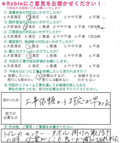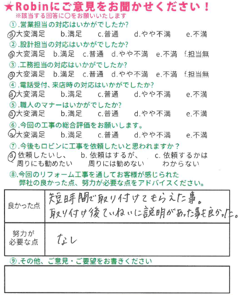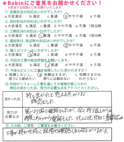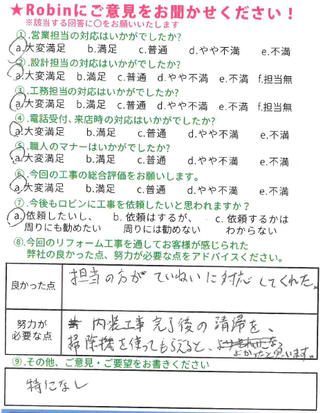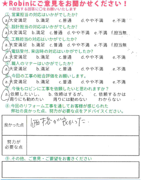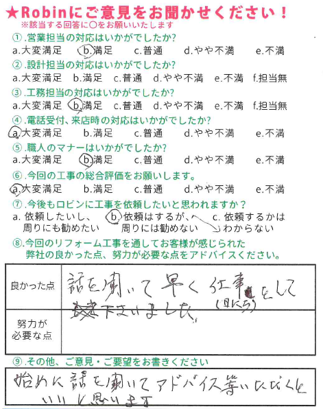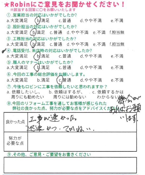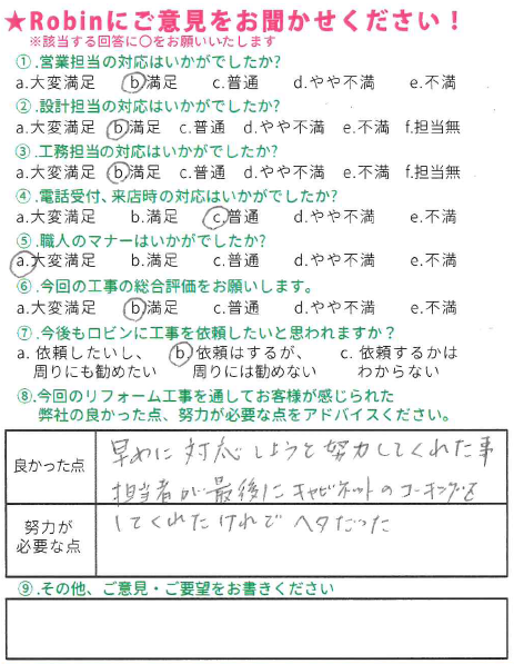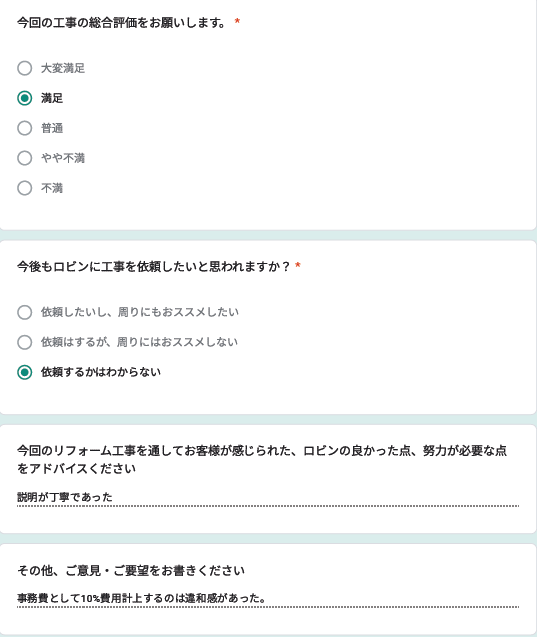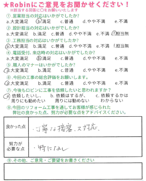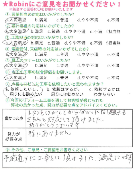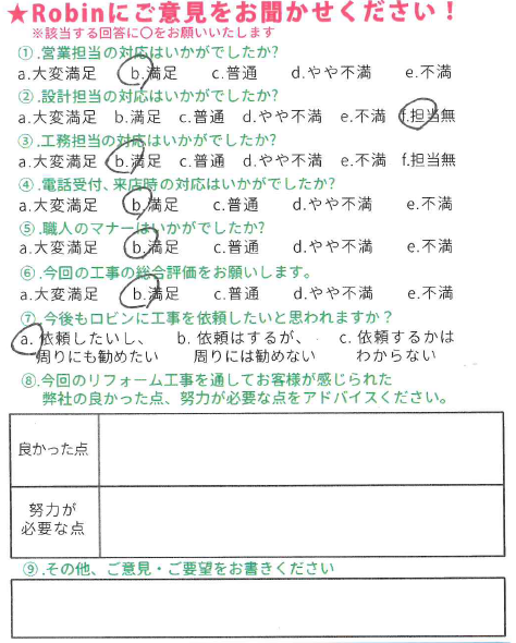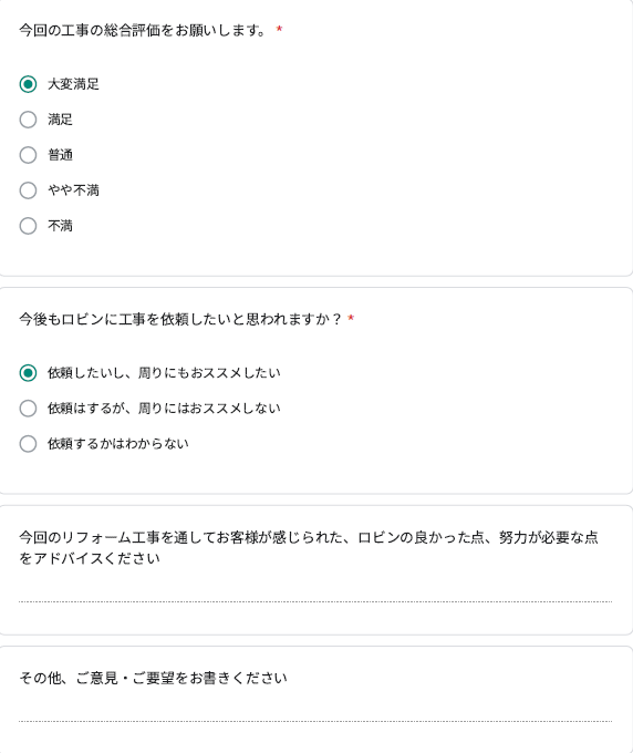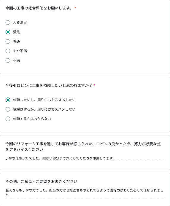 ロビンでは工事完了後に、全てのお客様対象に『お客様アンケート』を依頼させて頂いています。「リフォームして良かった」というご満足の声、「もっとこうして欲しかった」「ここが不満」というご指摘やご意見にも全社員が目を通し、対応の改善や新しいサービスのご提供に取組んでいます。これからロビンと出会うお客様にも「ありがとう」「うれしい」をお届けできますように、お客様一人一人に誠実に向き合うことを大切にしています。