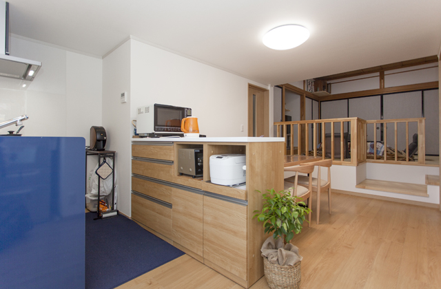 地下にあった水まわりは1階へ。LDKを広く確保するために段差を取り込みました。