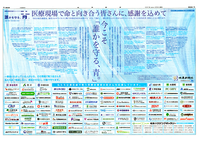 岐阜新聞社が企画した、医療現場で命と向き合う皆さんを支援するキャンペーン「誰かを守る、青。」に協賛させていただきました。2/5(金)の朝刊紙面に一般の方々からのメッセージと協賛企業のロゴが掲載されています。