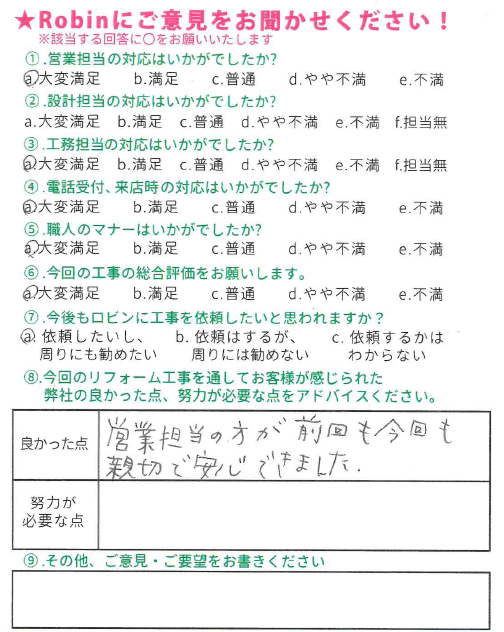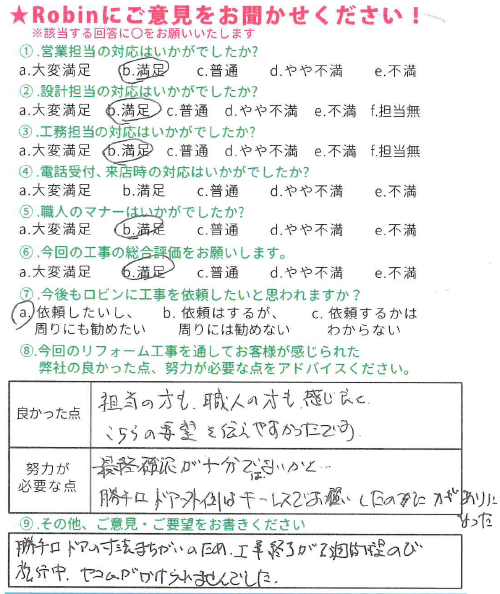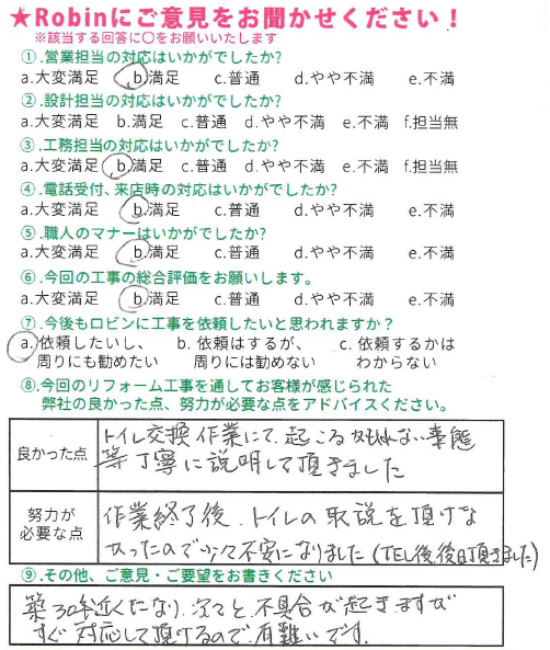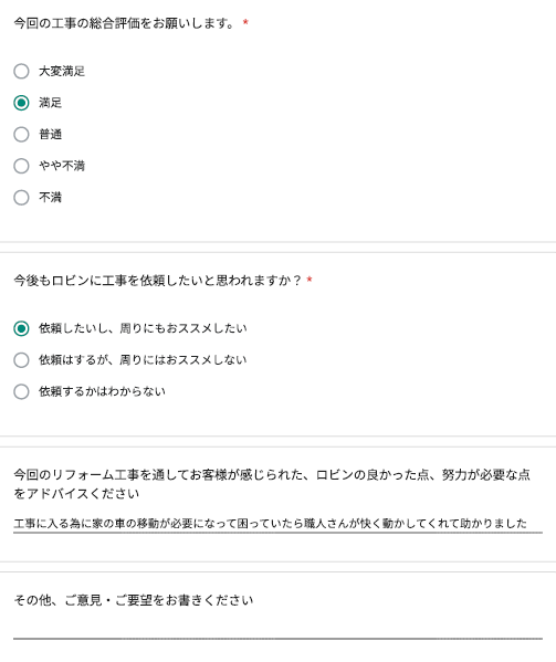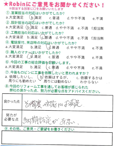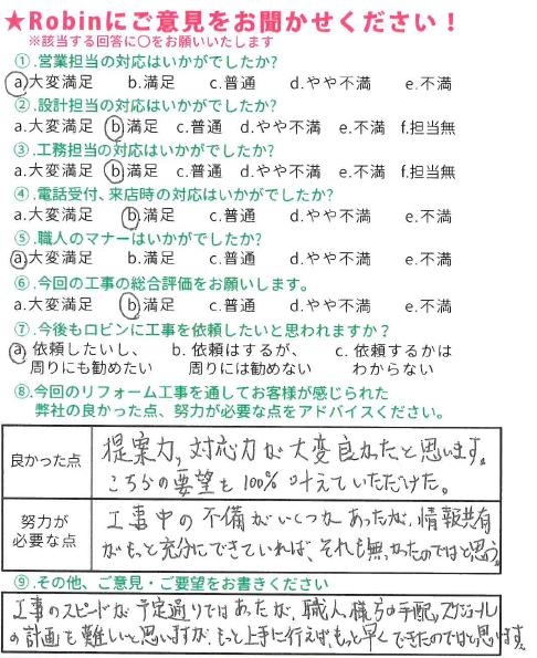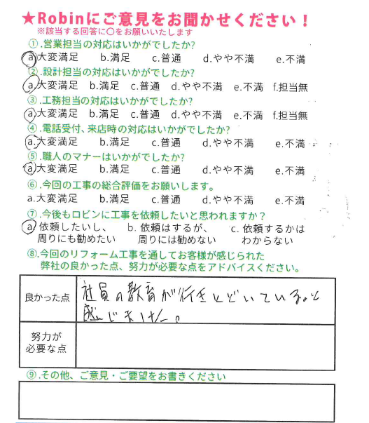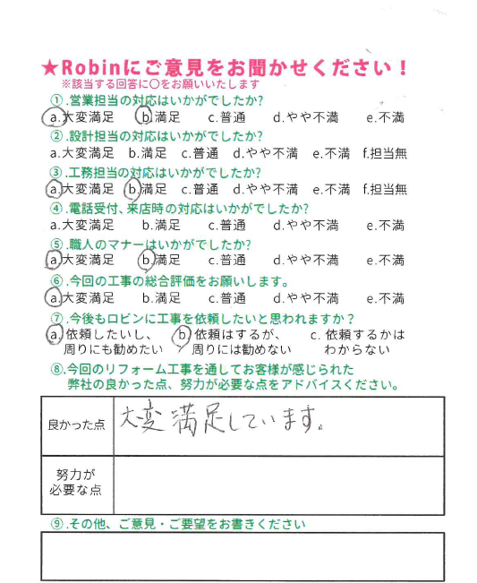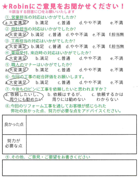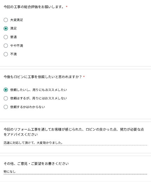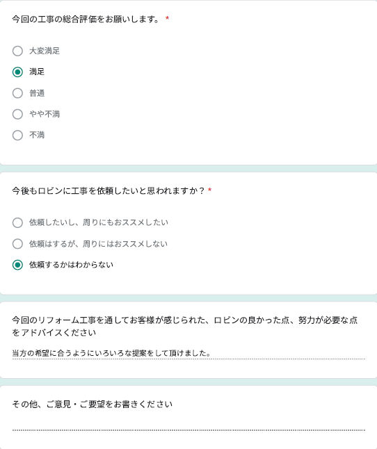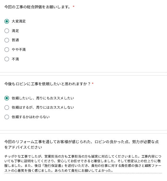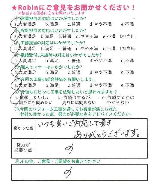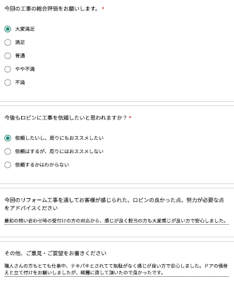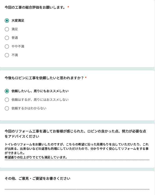 ロビンでは工事完了後に、全てのお客様対象に『お客様アンケート』を依頼させて頂いています。「リフォームして良かった」というご満足の声、「もっとこうして欲しかった」「ここが不満」というご指摘やご意見にも全社員が目を通し、対応の改善や新しいサービスのご提供に取組んでいます。これからロビンと出会うお客様にも「ありがとう」「うれしい」をお届けできますように、お客様一人一人に誠実に向き合うことを大切にしています。
