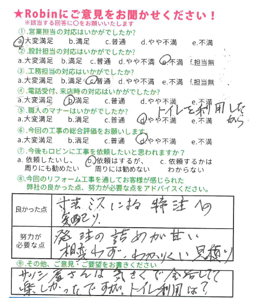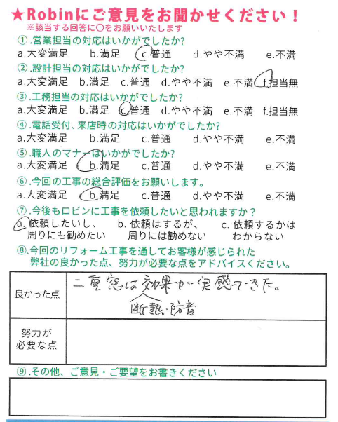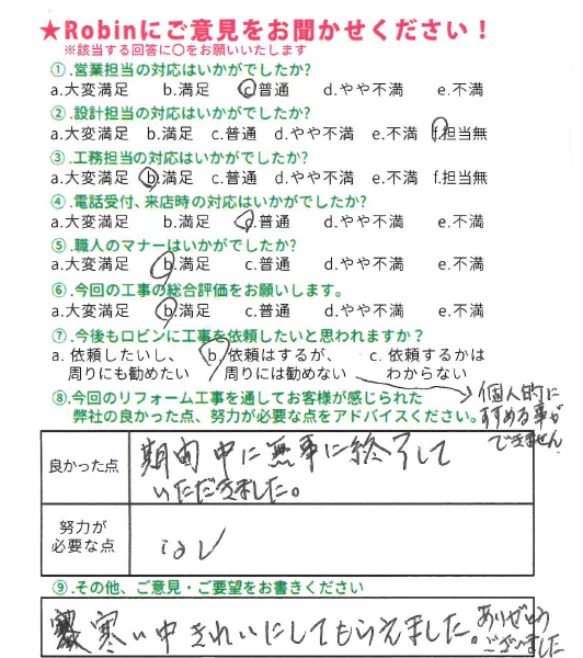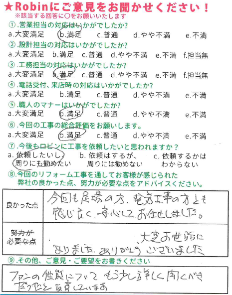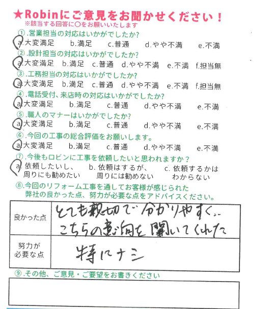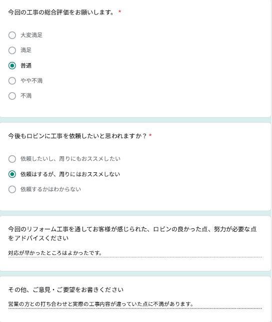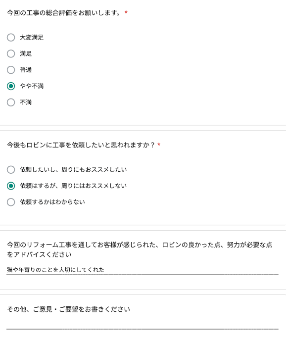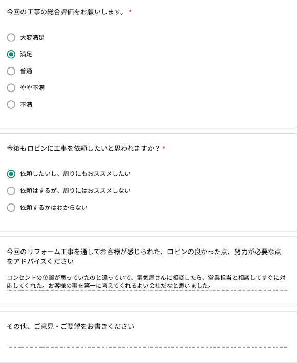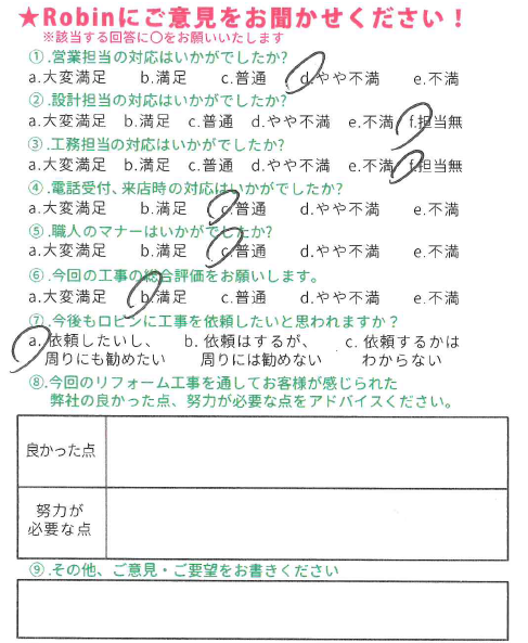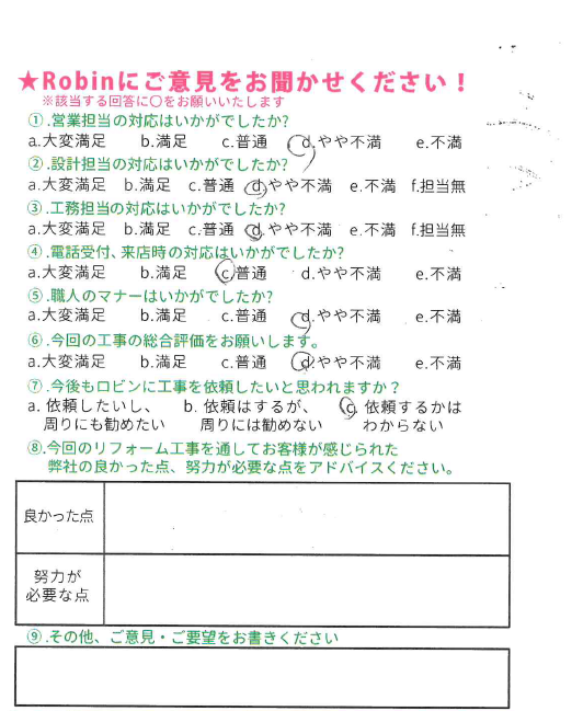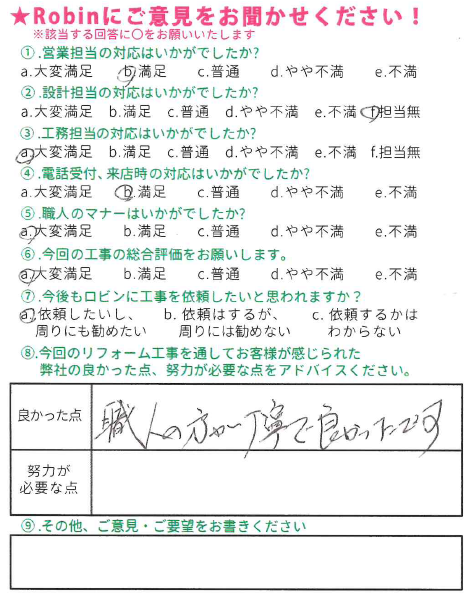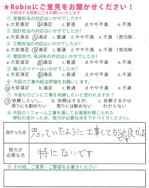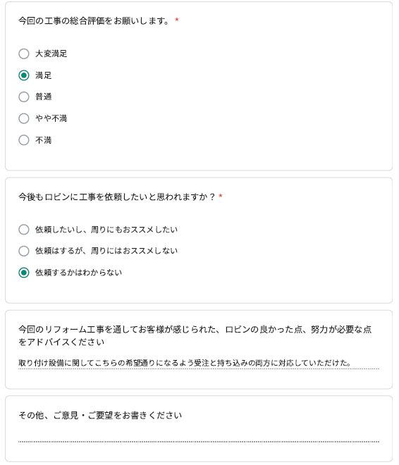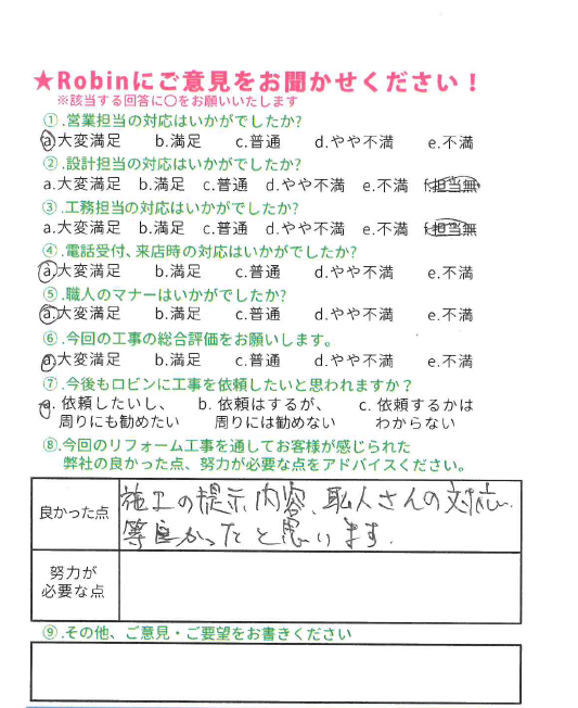 ロビンでは工事完了後に、全てのお客様対象に『お客様アンケート』を依頼させて頂いています。「リフォームして良かった」というご満足の声、「もっとこうして欲しかった」「ここが不満」というご指摘やご意見にも全社員が目を通し、対応の改善や新しいサービスのご提供に取組んでいます。これからロビンと出会うお客様にも「ありがとう」「うれしい」をお届けできますように、お客様一人一人に誠実に向き合うことを大切にしています。