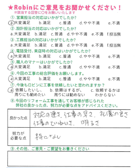 この度は弊社にリフォーム工事をお任せ頂きまして、誠にありがとうございました。 また素晴らしい評価とコメントを頂き、嬉しく思っております。 リフォームをきっかけにお家を守る、長いお付き合いが出来れば幸いです。これからの生活が益々豊かなものとなりますようお祈りしております。 この度は誠に有難うございました!