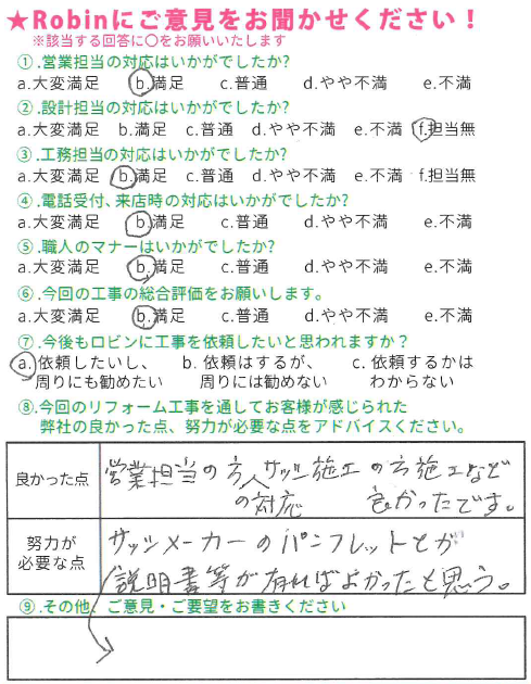 営業担当の方の対応、サッシ施工の方の施工など良かったです。