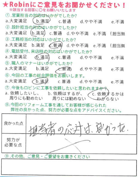 この度はリフォーム工事をお任せ頂きまして、誠にありがとうございました。 またご評価もありがとうございます。 経験を積み、よりご満足いただけるようなご提案が出来るように精進してまいります。 お困りのことがございましたら、いつでもご相談下さい。今後ともよろしくお願い致します。