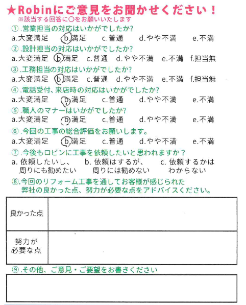 この度は弊社にリフォーム工事をお任せ頂きまして、誠にありがとうございました。 またこのような素晴らしい評価を頂き、嬉しく思っております。 リフォームをきっかけにお家を守る、長いお付き合いが出来れば幸いです。これからの生活が益々豊かなものとなりますようお祈りしております。 この度は誠にありがとうございました!