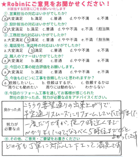 この度は弊社にリフォーム工事をお任せ頂きまして、誠にありがとうございました。 またこのような素晴らしい評価とコメントを頂き、嬉しく思っております。 リフォームをきっかけにお家を守る、長いお付き合いが出来れば幸いです。これからの生活が益々豊かなものとなりますようお祈りしております。 この度は誠に有難うございました!