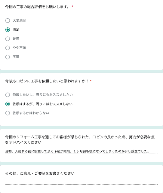 この度はリフォーム工事をお任せ頂きまして、誠にありがとうございました。 納期の遅れにてご迷惑をお掛けしまして、大変申し訳ございませんでした。 ご不安にならないようにご連絡もこまめにさせて頂くように改善して参ります。 お困りのことがございましたら、いつでもご相談下さい。今後ともよろしくお願い致します。