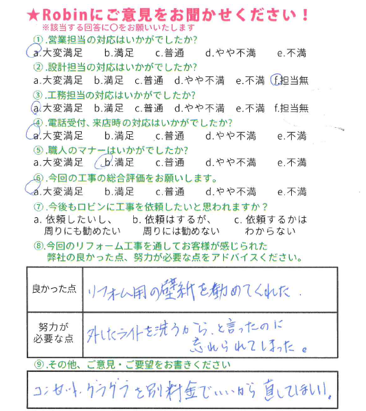この度はリフォーム工事をお任せ頂きまして、誠にありがとうございました。 またご評価もありがとうございます。 経験を積み、よりご満足いただけるようなご提案が出来るように精進してまいります。 お困りのことがございましたら、いつでもご相談下さい。今後ともよろしくお願い致します。