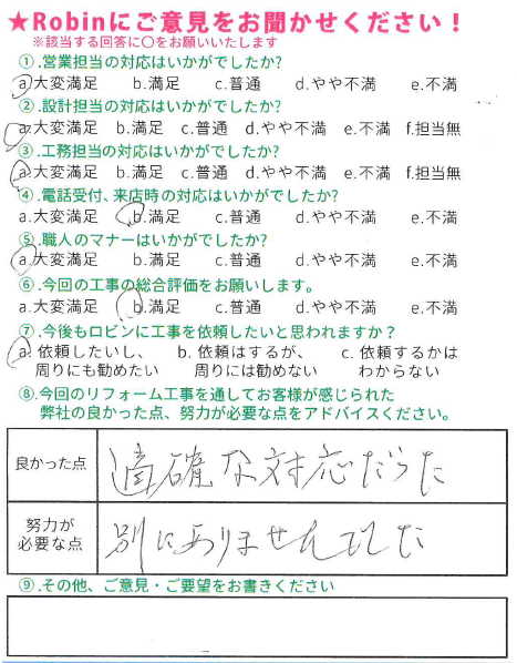 この度は弊社にリフォーム工事をお任せ頂きまして、誠にありがとうございました。 またこのような大変素晴らしい評価とコメントを頂き、嬉しく思っております。 リフォームをきっかけにお家を守る、長いお付き合いが出来れば幸いです。これからの生活が益々豊かなものとなりますようお祈りしております。 この度は誠に有難うございました!