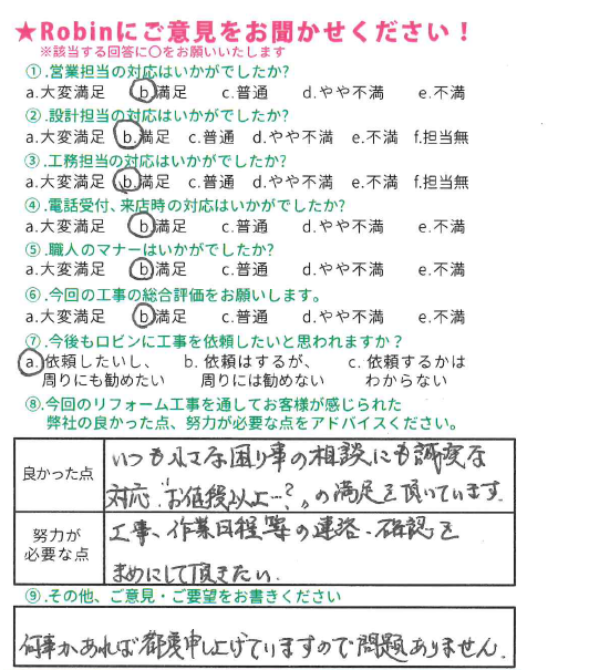 この度は弊社にリフォーム工事をお任せ頂きまして、誠にありがとうございました。 また素晴らしい評価とコメントを頂き、嬉しく思っております。 リフォームをきっかけにお家を守る、長いお付き合いが出来れば幸いです。これからの生活が益々豊かなものとなりますようお祈りしております。 この度は誠に有難うございました!