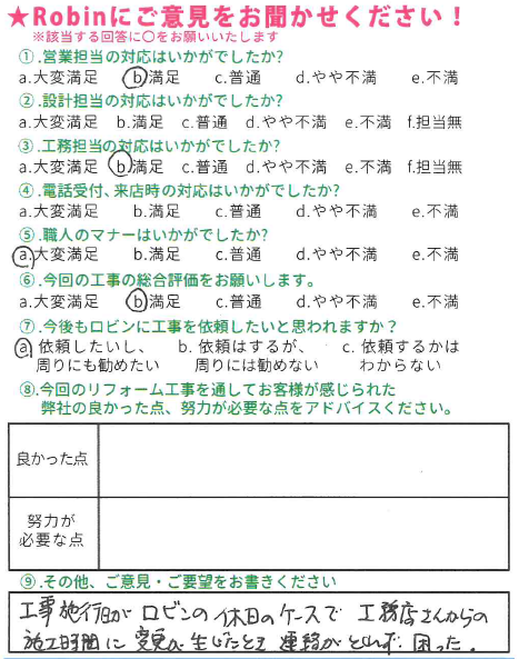 この度はリフォーム工事をお任せ頂きまして、誠にありがとうございました。 連絡や共有不足によりご迷惑をおかけし、大変申し訳ございませんでした。 社内にて見直し改善して参ります。 お困りのことがございましたら、いつでもご相談下さい。今後ともよろしくお願いいたします。