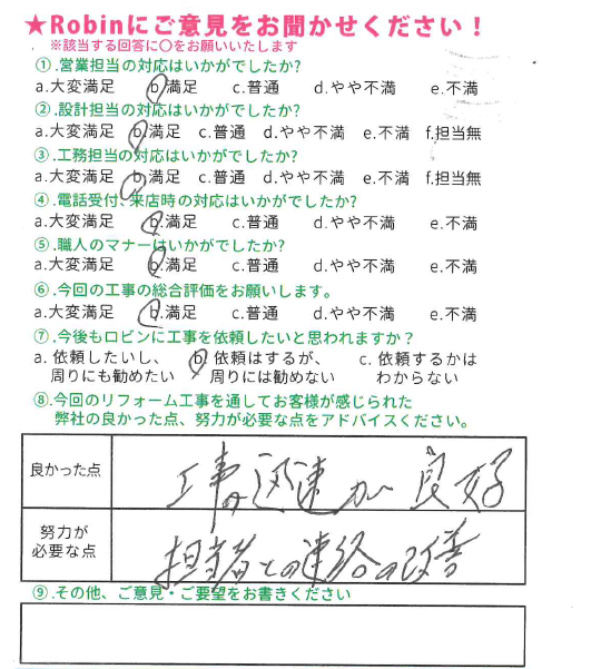 この度はリフォーム工事をお任せ頂きまして、誠にありがとうございました。 またご評価もありがとうございます。 経験を積み、よりご満足いただけるようなご提案が出来るように精進してまいります。 お困りのことがございましたら、いつでもご相談下さい。今後ともよろしくお願い致します。