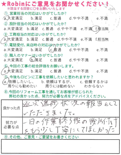 この度はリフォーム工事をお任せ頂きまして、誠にありがとうございました。 清掃の不足によりご迷惑をおかけし、大変申し訳ございませんでした。 社内にて見直し改善して参ります。 お困りのことがございましたら、いつでもご相談下さい。今後ともよろしくお願い致します。