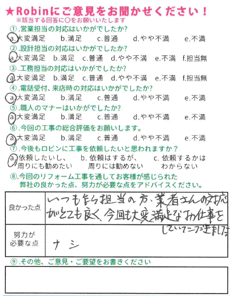 - いつもながら担当の方・業者さんの対応がとても良く、今回も大変満足なお仕事をしていただきました。