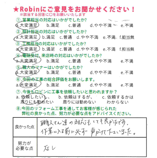 この度は弊社にリフォーム工事をお任せ頂きまして、誠にありがとうございました。 またこのような大変素晴らしい評価とコメントを頂き、嬉しく思っております。 リフォームをきっかけにお家を守る、長いお付き合いが出来れば幸いです。これからの生活が益々豊かなものとなりますようお祈りしております。 この度は誠に有難うございました!