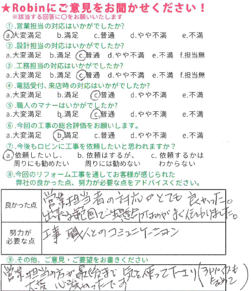 この度は弊社にリフォーム工事をお任せ頂きまして、誠にありがとうございました。 またこのような素晴らしい評価とコメントを頂き、嬉しく思っております。 リフォームをきっかけにお家を守る、長いお付き合いが出来れば幸いです。これからの生活が益々豊かなものとなりますようお祈りしております。 この度は誠に有難うございました!