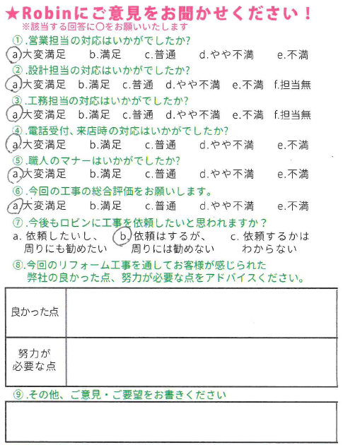 この度は弊社にリフォーム工事をお任せ頂きまして、誠にありがとうございました。 またこのような評価を頂き、嬉しく思っております。 リフォームをきっかけにお家を守る、長いお付き合いが出来れば幸いです。これからの生活が益々豊かなものとなりますようお祈りしております。 この度は誠にありがとうございました!