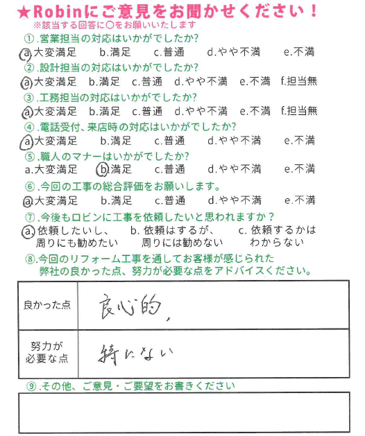 この度は弊社にリフォーム工事をお任せ頂きまして、誠にありがとうございました。 また素晴らしい評価とコメントを頂き、嬉しく思っております。 リフォームをきっかけにお家を守る、長いお付き合いが出来れば幸いです。これからの生活が益々豊かなものとなりますようお祈りしております。 この度は誠に有難うございました!