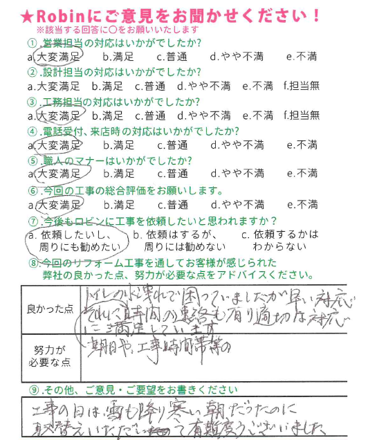 この度は弊社にリフォーム工事をお任せ頂きまして、誠にありがとうございました。 またこのような大変素晴らしい評価とコメントを頂き、嬉しく思っております。 リフォームをきっかけにお家を守る、長いお付き合いが出来れば幸いです。これからの生活が益々豊かなものとなりますようお祈りしております。 この度は誠に有難うございました!