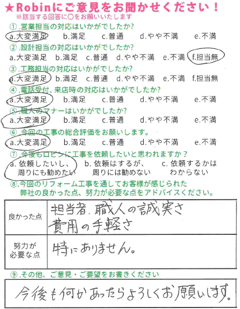 この度は弊社にリフォーム工事をお任せ頂きまして、誠にありがとうございました。 またこのような大変素晴らしい評価とコメントを頂き、嬉しく思っております。 リフォームをきっかけにお家を守る、長いお付き合いが出来れば幸いです。これからの生活が益々豊かなものとなりますようお祈りしております。 この度は誠に有難うございました!