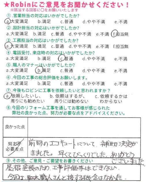 - 前回のエコキュートについて補助決定がきました。早くてびっくりでした。ありがとうございました。 屋根塗装のため工事評価等はできない。今回は職人さんと接する機会はなかった。