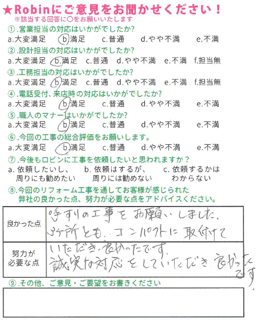 この度は弊社にリフォーム工事をお任せ頂きまして、誠にありがとうございました。 またこのような素晴らしい評価とコメントを頂き、嬉しく思っております。 リフォームをきっかけにお家を守る、長いお付き合いが出来れば幸いです。これからの生活が益々豊かなものとなりますようお祈りしております。 この度は誠にありがとうございました!