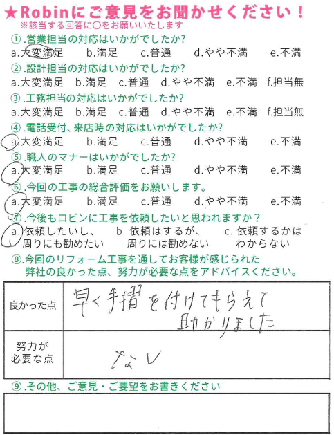 この度は弊社にリフォーム工事をお任せ頂きまして、誠にありがとうございました。 またこのような大変素晴らしい評価とコメントを頂き、嬉しく思っております。 リフォームをきっかけにお家を守る、長いお付き合いが出来れば幸いです。これからの生活が益々豊かなものとなりますようお祈りしております。 この度は誠に有難うございました!