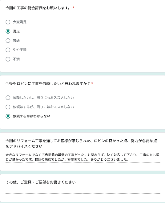- 大きなリフォームでなく広告掲載の単発の工事だったにも関わらず、快く対応して下さり、工事の方も感じが良かったです。初回の来店でしたが、好印象でした。ありがとうございました。