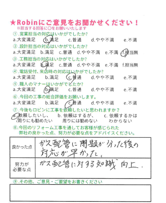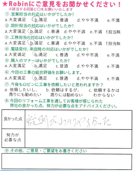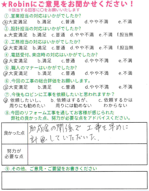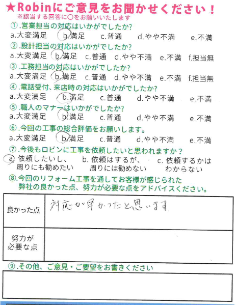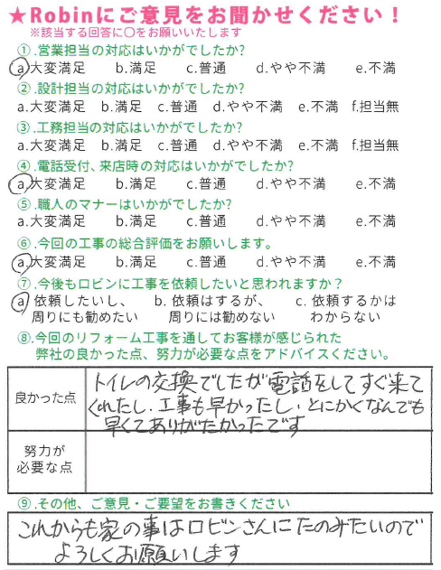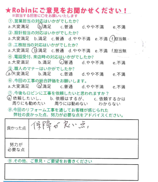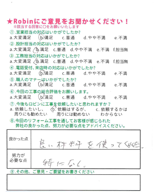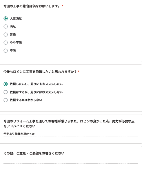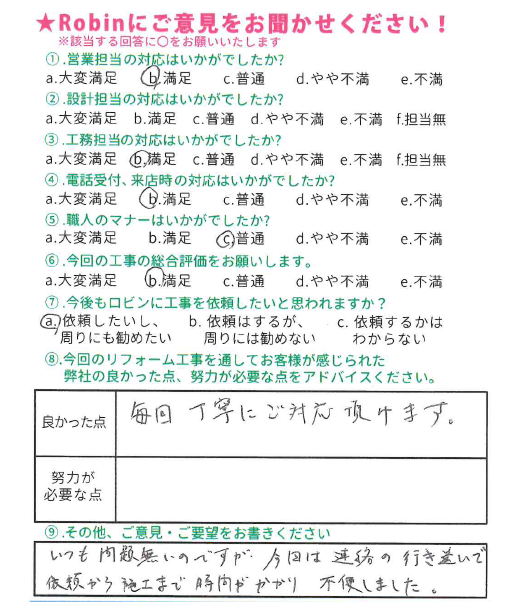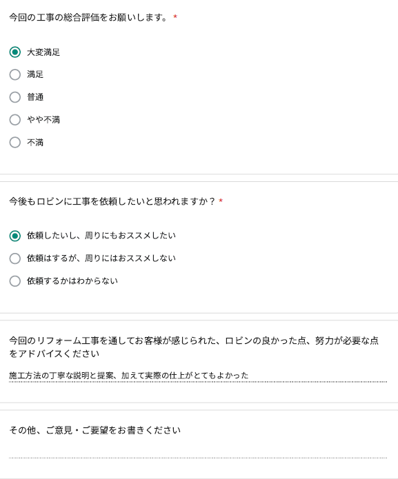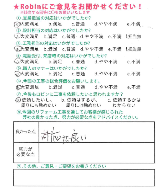 ロビンでは工事完了後に、全てのお客様対象に『お客様アンケート』を依頼させて頂いています。「リフォームして良かった」というご満足の声、「もっとこうして欲しかった」「ここが不満」というご指摘やご意見にも全社員が目を通し、対応の改善や新しいサービスのご提供に取組んでいます。これからロビンと出会うお客様にも「ありがとう」「うれしい」をお届けできますように、お客様一人一人に誠実に向き合うことを大切にしています。