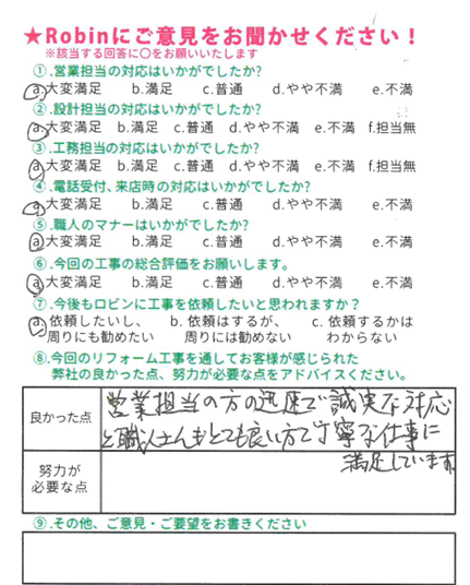 ロビンでは工事完了後に、全てのお客様対象に『お客様アンケート』を依頼させて頂いています。「リフォームして良かった」というご満足の声、「もっとこうして欲しかった」「ここが不満」というご指摘やご意見にも全社員が目を通し、対応の改善や新しいサービスのご提供に取組んでいます。これからロビンと出会うお客様にも「ありがとう」「うれしい」をお届けできますように、お客様一人一人に誠実に向き合うことを大切にしています。