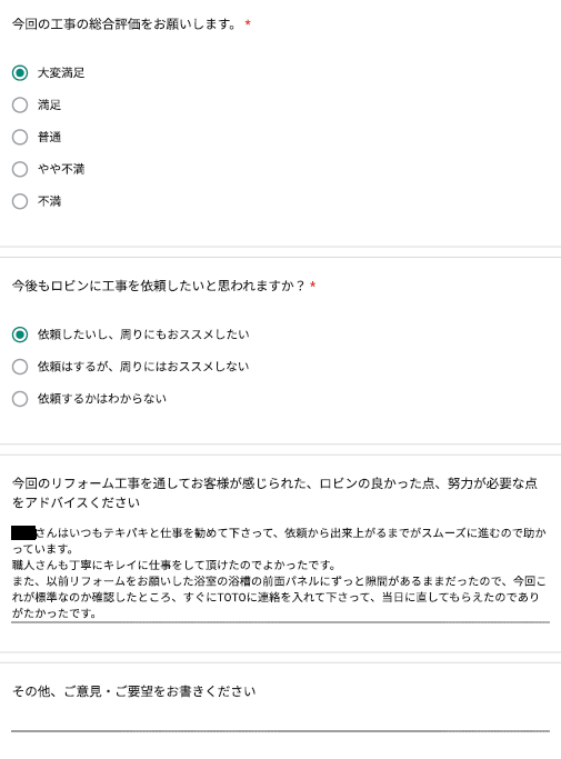 ロビンでは工事完了後に、全てのお客様対象に『お客様アンケート』を依頼させて頂いています。「リフォームして良かった」というご満足の声、「もっとこうして欲しかった」「ここが不満」というご指摘やご意見にも全社員が目を通し、対応の改善や新しいサービスのご提供に取組んでいます。これからロビンと出会うお客様にも「ありがとう」「うれしい」をお届けできますように、お客様一人一人に誠実に向き合うことを大切にしています。