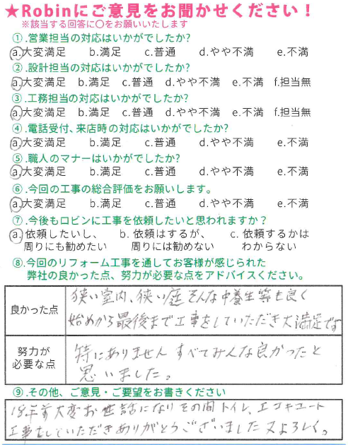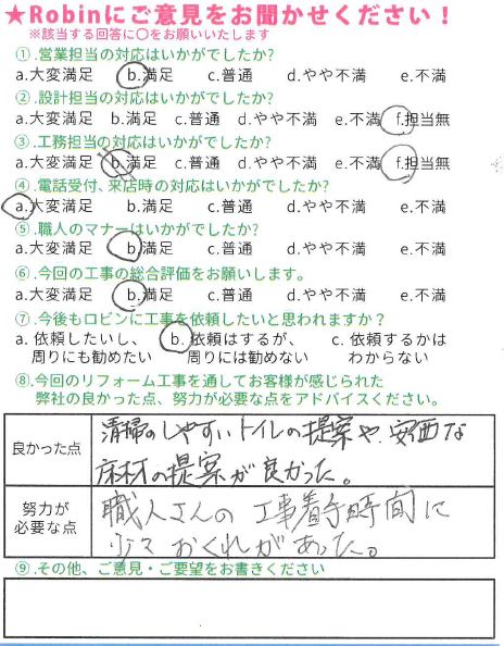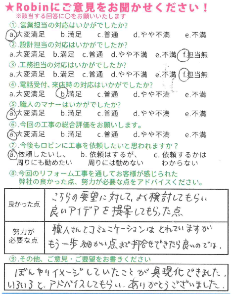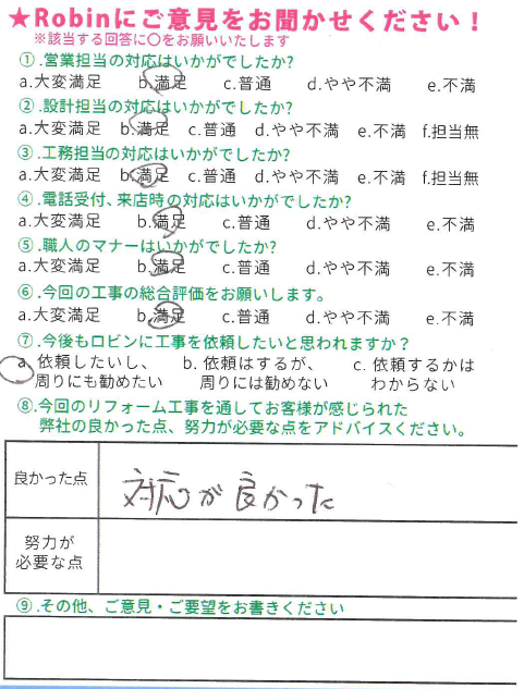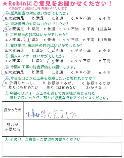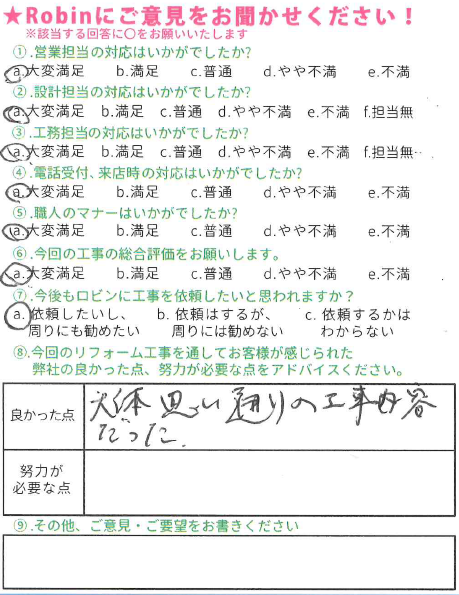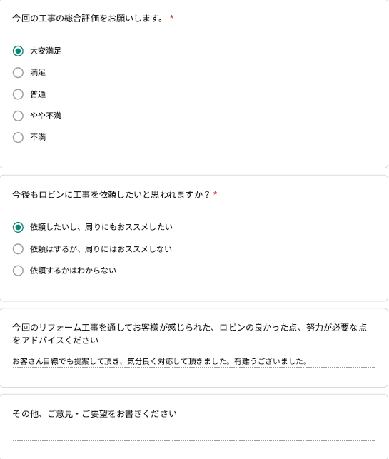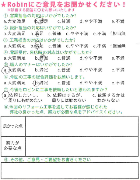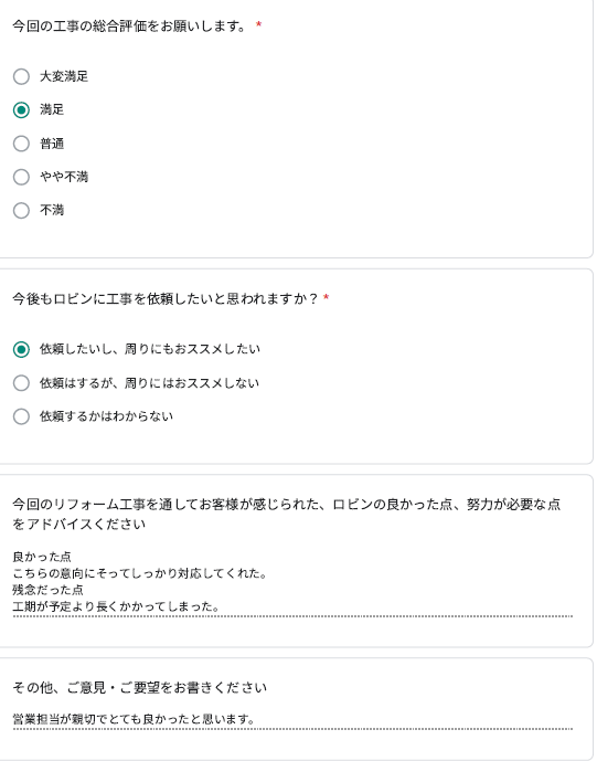 ロビンでは工事完了後に、全てのお客様対象に『お客様アンケート』を依頼させて頂いています。「リフォームして良かった」というご満足の声、「もっとこうして欲しかった」「ここが不満」というご指摘やご意見にも全社員が目を通し、対応の改善や新しいサービスのご提供に取組んでいます。これからロビンと出会うお客様にも「ありがとう」「うれしい」をお届けできますように、お客様一人一人に誠実に向き合うことを大切にしています。