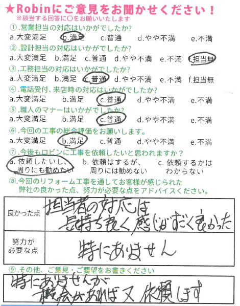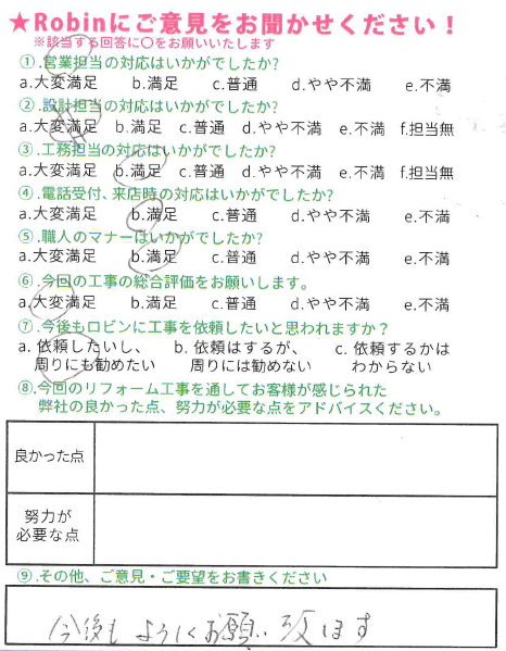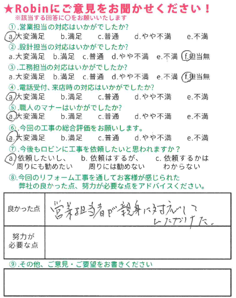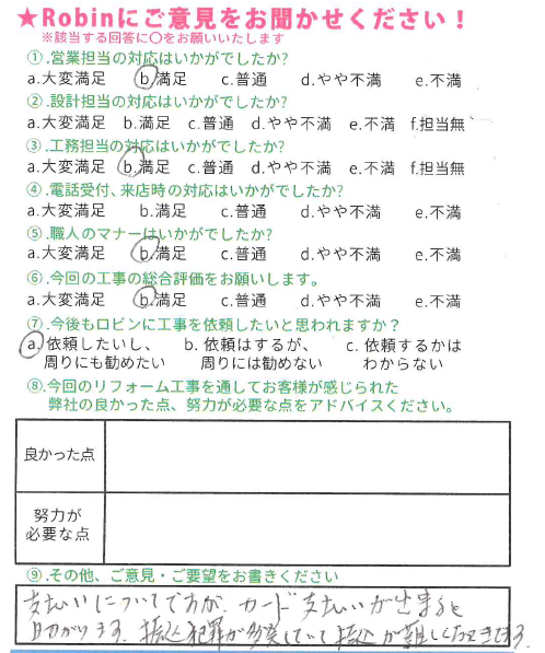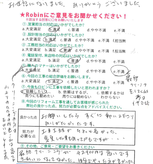 ロビンでは工事完了後に、全てのお客様対象に『お客様アンケート』を依頼させて頂いています。「リフォームして良かった」というご満足の声、「もっとこうして欲しかった」「ここが不満」というご指摘やご意見にも全社員が目を通し、対応の改善や新しいサービスのご提供に取組んでいます。これからロビンと出会うお客様にも「ありがとう」「うれしい」をお届けできますように、お客様一人一人に誠実に向き合うことを大切にしています。