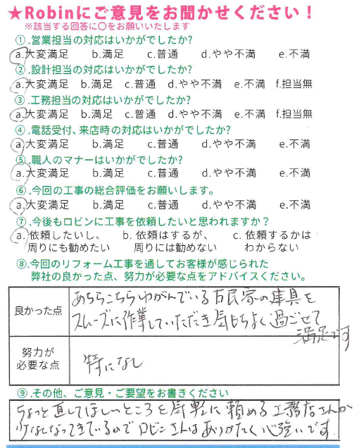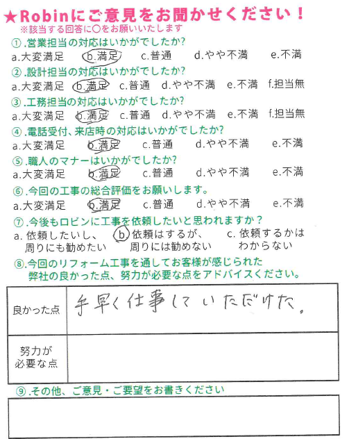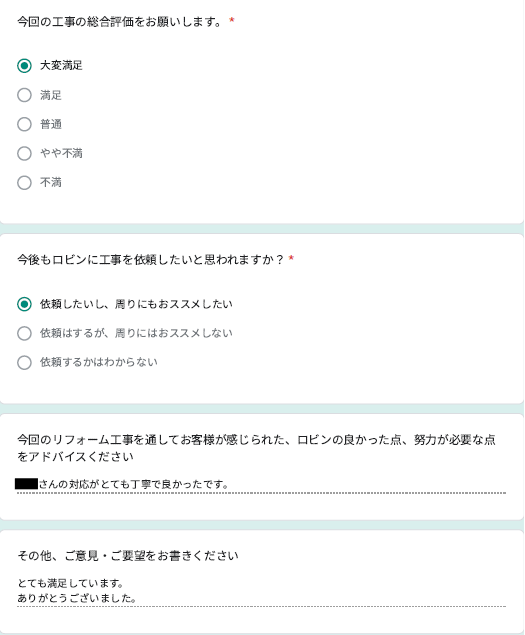 ロビンでは工事完了後に、全てのお客様対象に『お客様アンケート』を依頼させて頂いています。「リフォームして良かった」というご満足の声、「もっとこうして欲しかった」「ここが不満」というご指摘やご意見にも全社員が目を通し、対応の改善や新しいサービスのご提供に取組んでいます。これからロビンと出会うお客様にも「ありがとう」「うれしい」をお届けできますように、お客様一人一人に誠実に向き合うことを大切にしています。