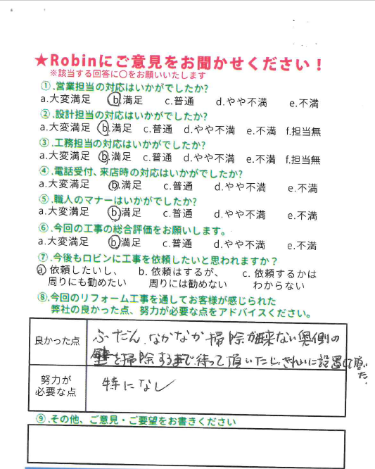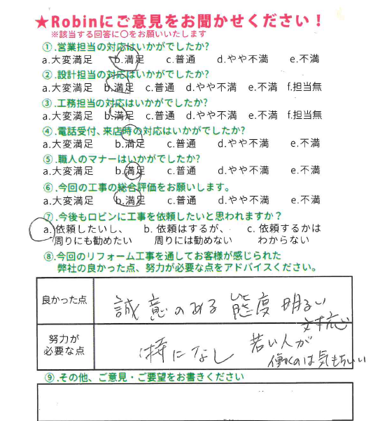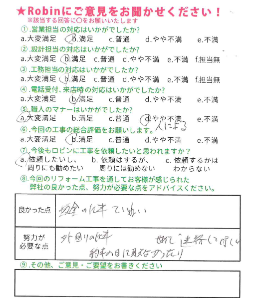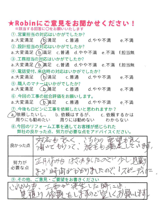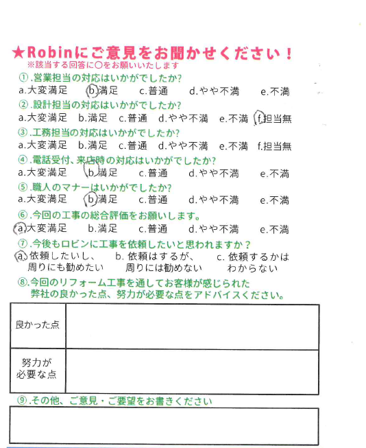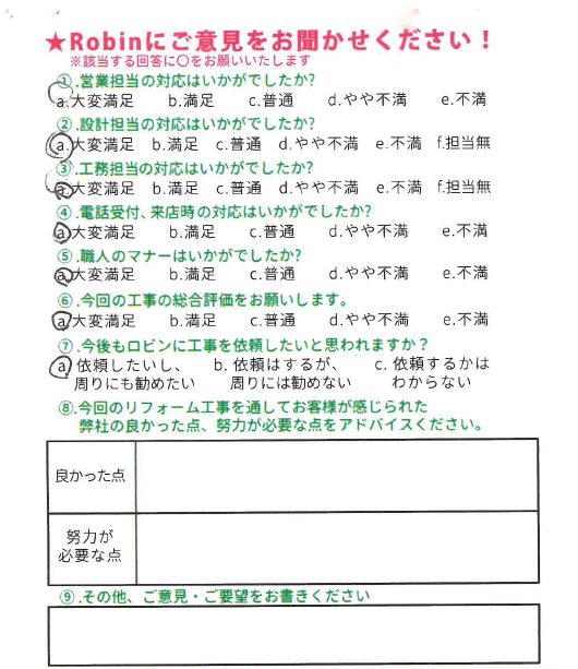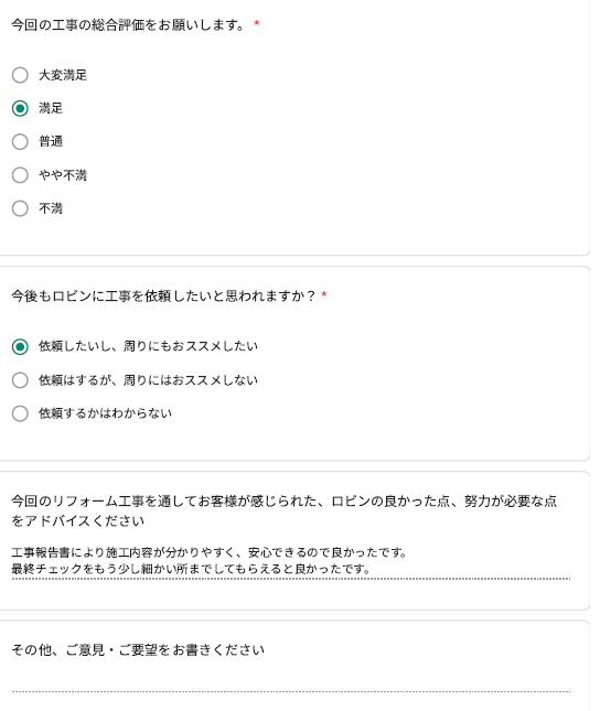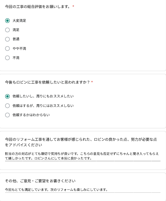 ロビンでは工事完了後に、全てのお客様対象に『お客様アンケート』を依頼させて頂いています。「リフォームして良かった」というご満足の声、「もっとこうして欲しかった」「ここが不満」というご指摘やご意見にも全社員が目を通し、対応の改善や新しいサービスのご提供に取組んでいます。これからロビンと出会うお客様にも「ありがとう」「うれしい」をお届けできますように、お客様一人一人に誠実に向き合うことを大切にしています。