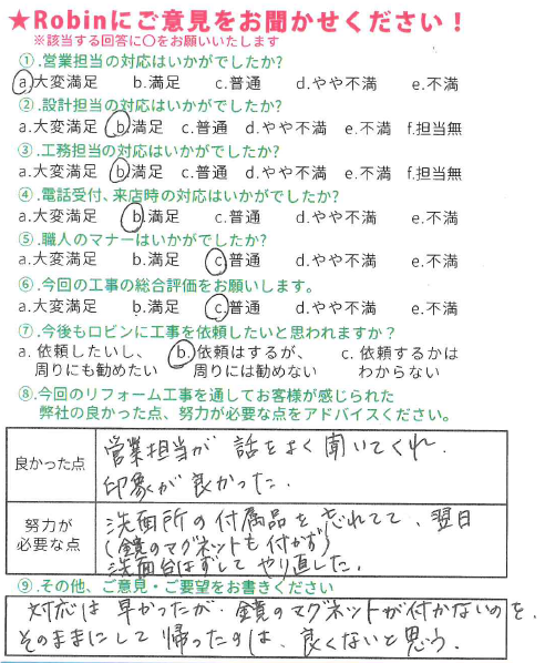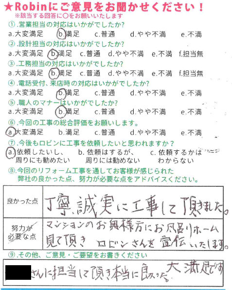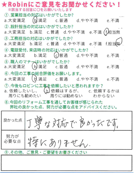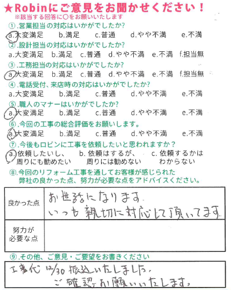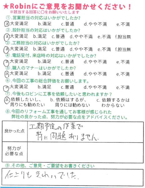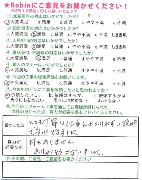 ロビンでは工事完了後に、全てのお客様対象に『お客様アンケート』を依頼させて頂いています。「リフォームして良かった」というご満足の声、「もっとこうして欲しかった」「ここが不満」というご指摘やご意見にも全社員が目を通し、対応の改善や新しいサービスのご提供に取組んでいます。これからロビンと出会うお客様にも「ありがとう」「うれしい」をお届けできますように、お客様一人一人に誠実に向き合うことを大切にしています。