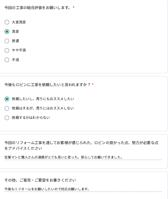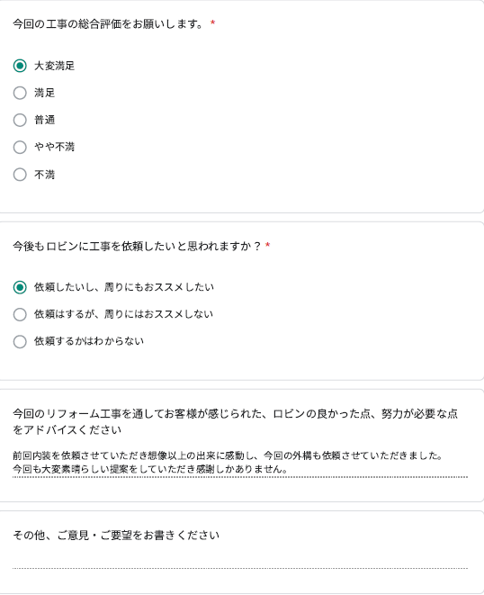 ロビンでは工事完了後に、全てのお客様対象に『お客様アンケート』を依頼させて頂いています。「リフォームして良かった」というご満足の声、「もっとこうして欲しかった」「ここが不満」というご指摘やご意見にも全社員が目を通し、対応の改善や新しいサービスのご提供に取組んでいます。これからロビンと出会うお客様にも「ありがとう」「うれしい」をお届けできますように、お客様一人一人に誠実に向き合うことを大切にしています。