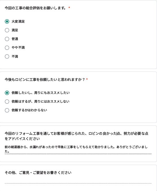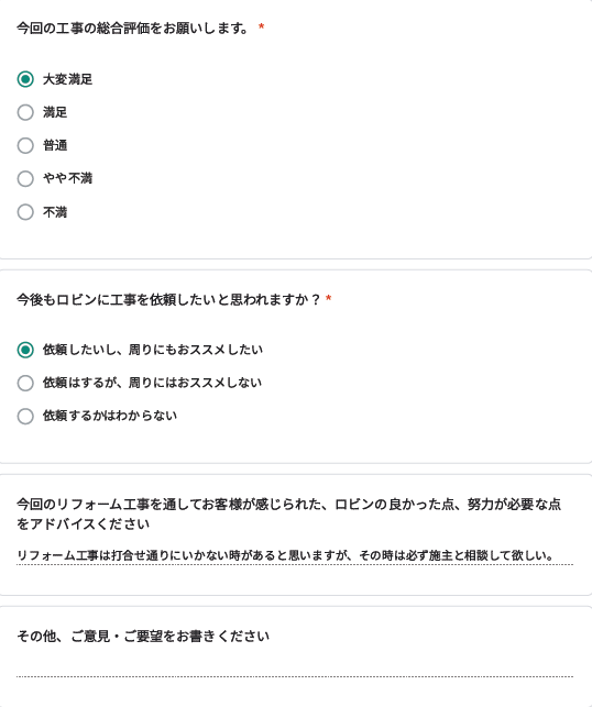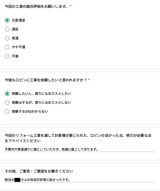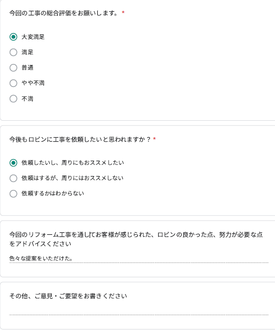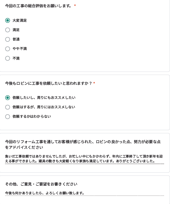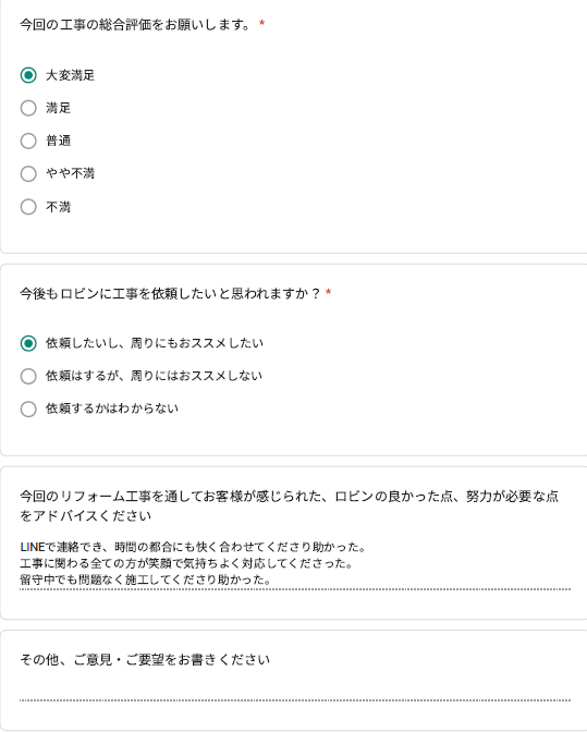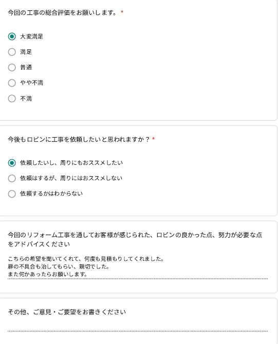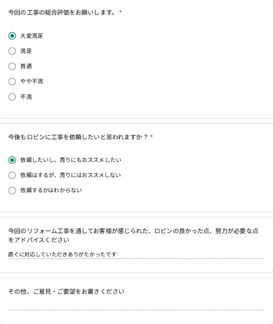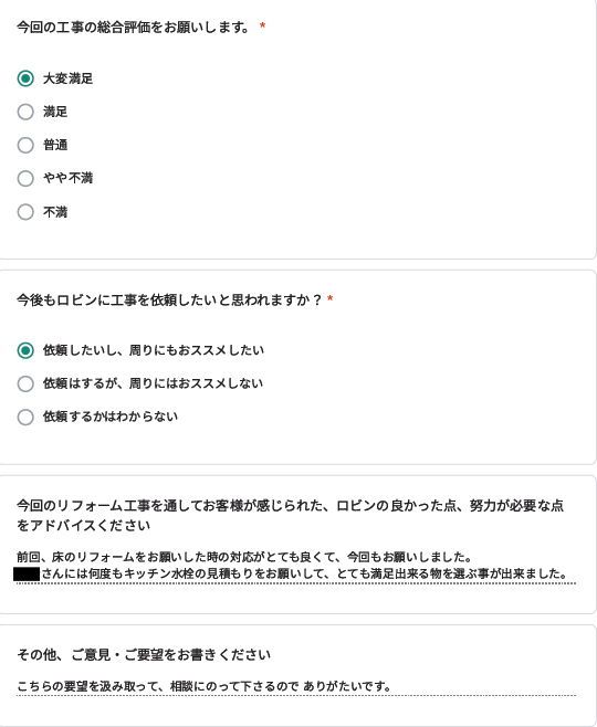 ロビンでは工事完了後に、全てのお客様対象に『お客様アンケート』を依頼させて頂いています。「リフォームして良かった」というご満足の声、「もっとこうして欲しかった」「ここが不満」というご指摘やご意見にも全社員が目を通し、対応の改善や新しいサービスのご提供に取組んでいます。これからロビンと出会うお客様にも「ありがとう」「うれしい」をお届けできますように、お客様一人一人に誠実に向き合うことを大切にしています。