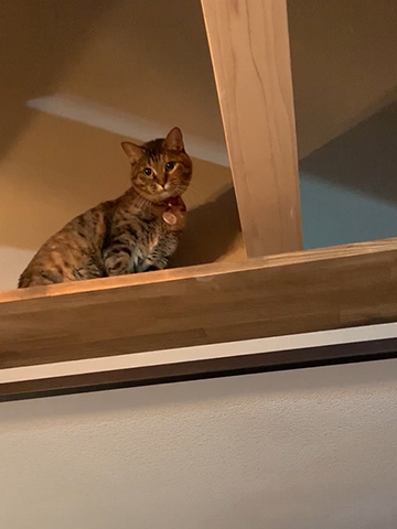 吹き抜けの梁は猫ちゃんが通れるか、現場でリハーサルを行いました。お施主様からは、『ネコ達のこともとても良く考えてくださって、出来上がった家は本当に満足いくものになりました。室内の色々な場所で遊んでいる猫達の姿をみて幸せを感じています。』と嬉しいお言葉を頂いております。