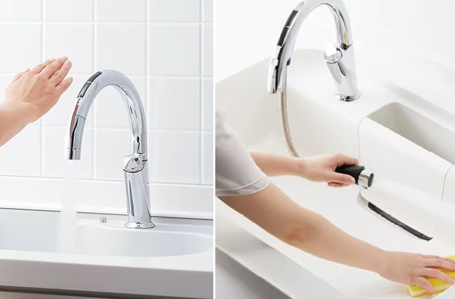 例えば駅のトイレのように手をかざすだけで水が出てくるタッチレス水栓や、浄水器一体型のオールインワン浄水栓など機能豊富です。