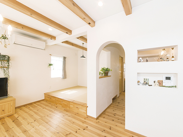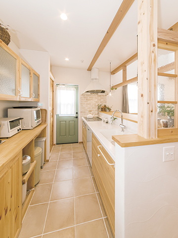 外観はオレンジ色の瓦屋根とピンク色の外壁で可愛らしく、内装は白壁と明るい木目のコントラストで清潔感のある雰囲気を出しました。間取りは「家族の繋がり」をテーマにプランしています。LDKには吹き抜けを設け上下の空間の繋がりを確保しました。ダイニングとリビングは腰壁にて緩やかに区切られています。キッチンはLDを見渡せる対面式を採用。奥様が一番長くいる場所なので、毎日気持ちよく過ごせるよう、ディテールにも色にもこだわりました。「理想通りのキッチンに仕上がりました!」と嬉しいお言葉を頂いています。