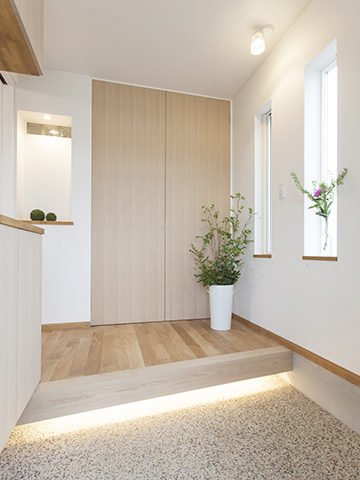 玄関土間は洗い出し仕上げ、屋根には和瓦を使用しました。ほんのりと和が感じられる、凛とした雰囲気の家です。