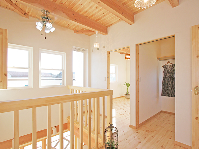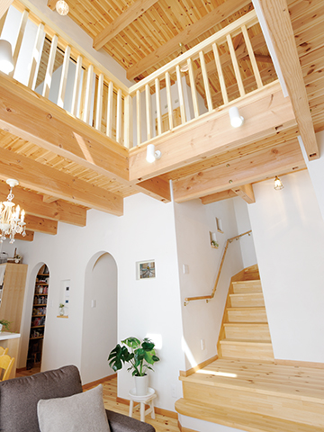 2階にはインナーバルコニーを付けました。1階と2階は一部吹き抜けになっています。バルコニーからはいっぱいに陽光が差し込んで、晴れた日はすごく明るくなります。2階の手すりは木製の格子手すりで木のぬくもりも感じられるように。光も風も通るこの階段は、家族のつながりを守ってくれる、欠かせない要素です。