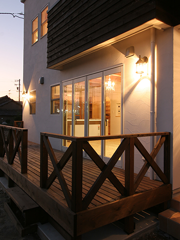 シンプルな外壁にべベルサイディングとウッドデッキが特徴の外観、一部吹き抜けとなったLDKが家族のつながりを強くします。キッチンは収納を含めてのフルオーダーです。キッチン用品の大きさ一つ一つを確認し、使い勝手も考慮しながら設計をし世界に一つだけの対面キッチンができました。水廻りもキッチンの近くに配置し、家事動線もスムーズに。リビングからは広い庭が見渡せ、季節の移ろいがいっそう感じられます。