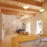 リビング階段と吹抜けのある明るいLDKです。リビングには南側の大きな窓からたっぷり日差しがはいり、陽だまりのような心地よさ。たっぷりと光が入るLDKの床には無垢のパイン材を使っています。触れた感じが優しく、家族はいつも裸足になってしまうほど。ロビンが提案した壁の羽目板は雰囲気も良く、コルクボードには家族の連絡板として大活躍しています。