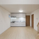 間取りはすっきりとした16坪の1LDKです。キッチンは壁付けタイプを採用し、家の中心に広い空間を取れるようにプランしました。LDKは14帖あり、お孫さんや友人が訪れた時も十分に団らんができます。プライベートな空間である寝室には、オープンな収納棚としっかり奥行きのある収納を造りつけました。室内の床はフラットにし安全に移動できるように、ほとんどの出入り口には引き戸を採用してバリアフリーにも配慮しています。