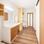 家の中央に位置する洗面室は約4.5帖とゆったりしたスペースで、廊下も兼ねておりどこからでもアクセスしやすくなっています。 玄関横には通り抜けできるシューズクローゼットを設け、急な来客でも玄関をいつもきれいに保てるようにしました。