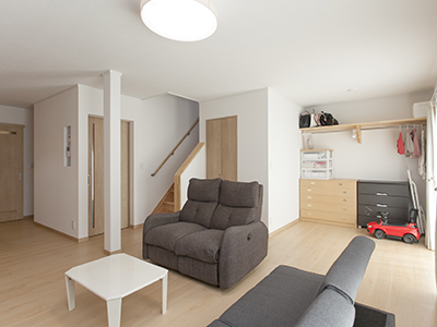1階は廊下をなくしてぐるりと回遊できる動線を造りました。玄関からLDK、水廻り、土間収納を通ってまた玄関へと繋がります。部屋と部屋の繋がりがスムーズになり家事が効率的になる事はもちろん、家族の気配が分かりやすいためコミュニケーションも活発に。土間収納には靴をたっぷり収納できる造作棚をも設けました。大型の季節用品なども収納できます。