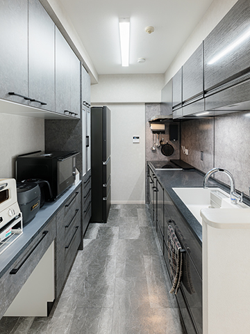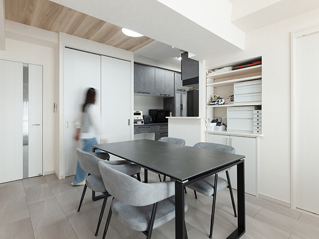 なかでもキッチンは奥様のこだわりが詰まった空間。深みのあるグレーを基調に整えることで、リビング・ダイニングとは程よく切り分けられた、落ち着きのある“ひとつの空間”として仕上がりました。