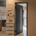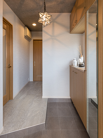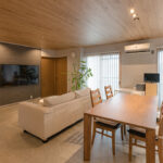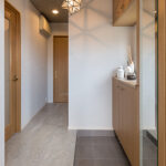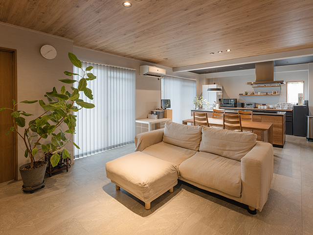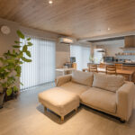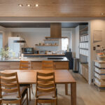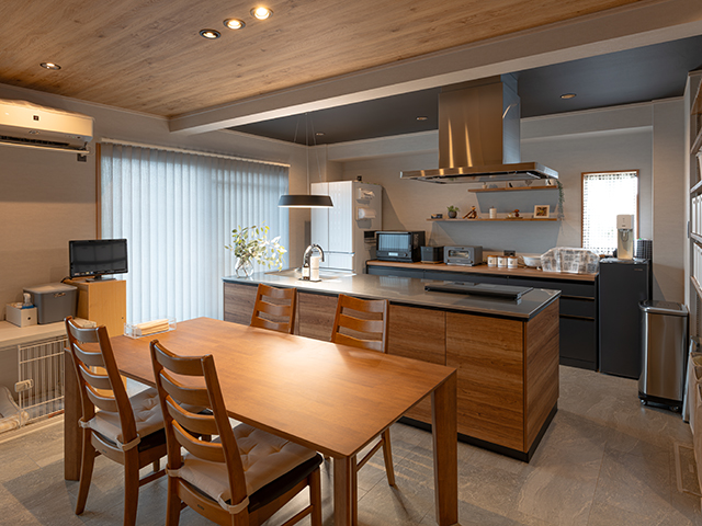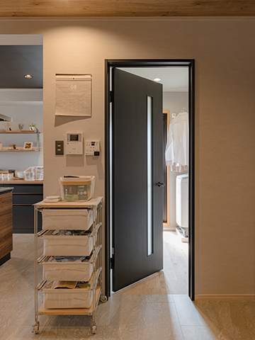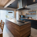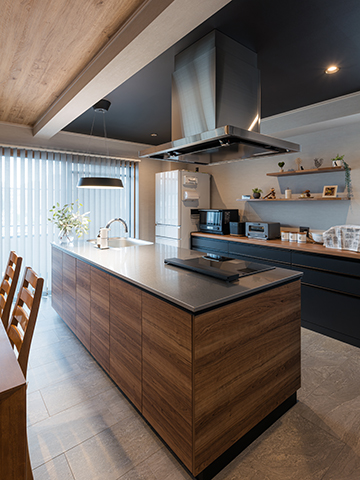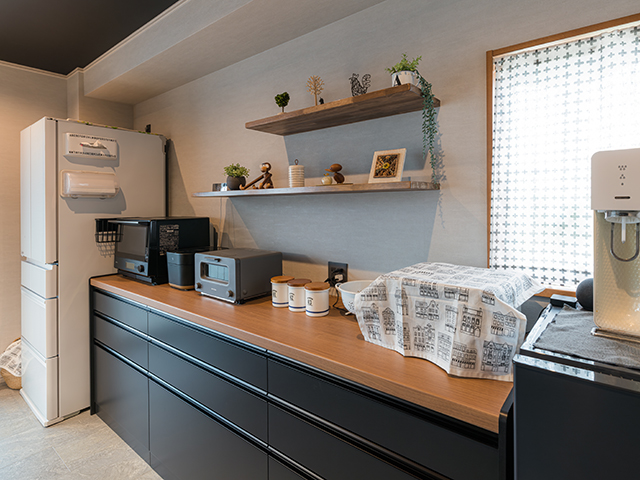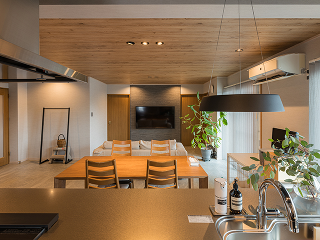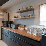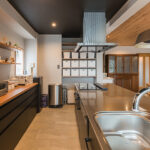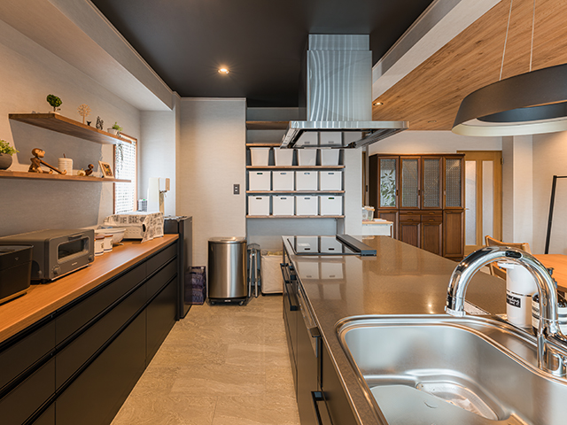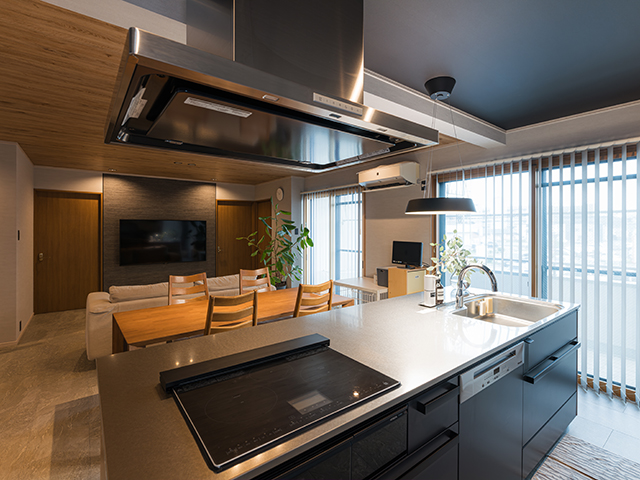 「好きなデザイナーさんの雰囲気を空間に取り入れたい」とご希望がありました。参考資料を見せていただきインテリアのプランに反映。時にこだわったのはキッチン回りです。天井は黒で仕上げ、リビングとはつながりを保ちつつ視覚的にメリハリのある仕上がりに。境界を美しく自然に仕上げるために、Robinからは「付け梁を間に設ける」という提案をさせていただきました。キッチンはクリナップのセントロを採用しています。